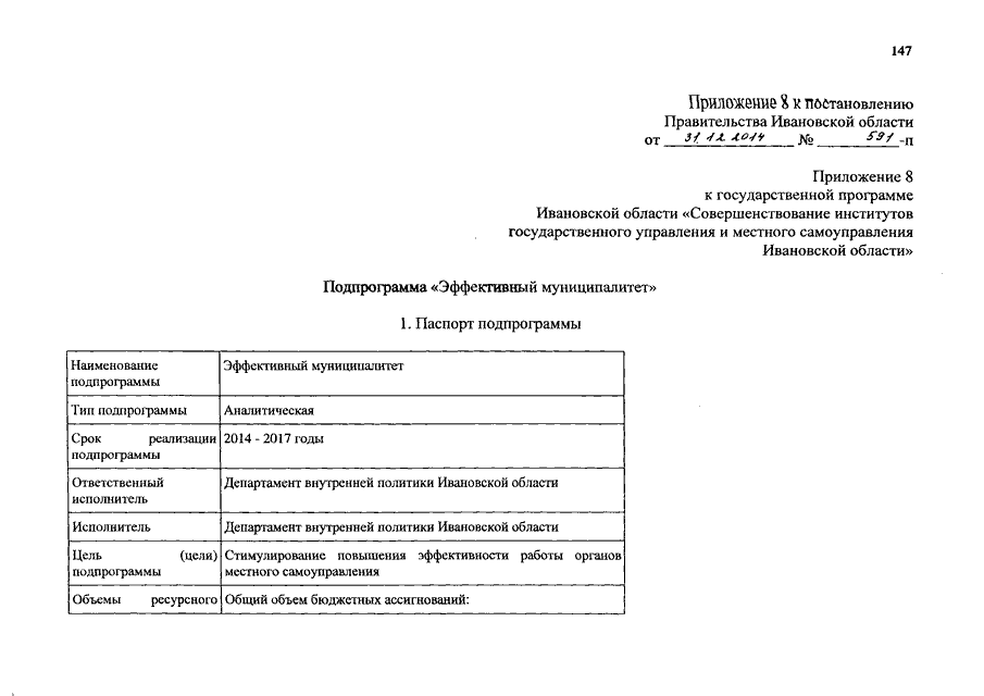 Постановление Правительства Ивановской области от 31.12.2014 N 591-п "О внесении изменений в постановление Правительства Ивановской области от 13.11.2013 N 454-п "Об утверждении государственной программы Ивановской области "Совершенствование институтов государственного управления и местного самоуправления Ивановской области" (вместе с "Подпрограммой "Обеспечение деятельности органов государственной власти Ивановской области", "Подпрограммой "Информационная открытость органов государственной власти Ивановской области", "Подпрограммой "Общественный контроль и экспертная поддержка органов государственной власти Ивановской области", "Подпрограммой "Поддержка социально ориентированных некоммерческих организаций", "Подпрограммой "Укрепление кадрового потенциала государственной службы Ивановской области", "Подпрограммой "Организация дополнительного пенсионного обеспечения отдельных категорий граждан", "Подпрограммой "Вручение государственных наград Российской Федерации, наград Ивановской области и выплата вознаграждений к ним, выплата премий к Почетным грамотам и других премий", "Подпрограммой "Эффективный муниципалитет", "Подпрограммой "Оценка регулирующего воздействия", "Подпрограммой "Организация предоставления государственных и муниципальных услуг на базе областного государственного бюджетного учреждения "Многофункциональный центр предоставления государственных и муниципальных услуг", "Подпрограммой "Организационная и консультационная поддержка национально-культурных автономий и общественных организаций", "Подпрограммой "Обеспечение деятельности мировых судей и аппаратов мировых судей Ивановской области")