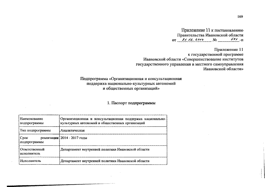 Постановление Правительства Ивановской области от 31.12.2014 N 591-п "О внесении изменений в постановление Правительства Ивановской области от 13.11.2013 N 454-п "Об утверждении государственной программы Ивановской области "Совершенствование институтов государственного управления и местного самоуправления Ивановской области" (вместе с "Подпрограммой "Обеспечение деятельности органов государственной власти Ивановской области", "Подпрограммой "Информационная открытость органов государственной власти Ивановской области", "Подпрограммой "Общественный контроль и экспертная поддержка органов государственной власти Ивановской области", "Подпрограммой "Поддержка социально ориентированных некоммерческих организаций", "Подпрограммой "Укрепление кадрового потенциала государственной службы Ивановской области", "Подпрограммой "Организация дополнительного пенсионного обеспечения отдельных категорий граждан", "Подпрограммой "Вручение государственных наград Российской Федерации, наград Ивановской области и выплата вознаграждений к ним, выплата премий к Почетным грамотам и других премий", "Подпрограммой "Эффективный муниципалитет", "Подпрограммой "Оценка регулирующего воздействия", "Подпрограммой "Организация предоставления государственных и муниципальных услуг на базе областного государственного бюджетного учреждения "Многофункциональный центр предоставления государственных и муниципальных услуг", "Подпрограммой "Организационная и консультационная поддержка национально-культурных автономий и общественных организаций", "Подпрограммой "Обеспечение деятельности мировых судей и аппаратов мировых судей Ивановской области")