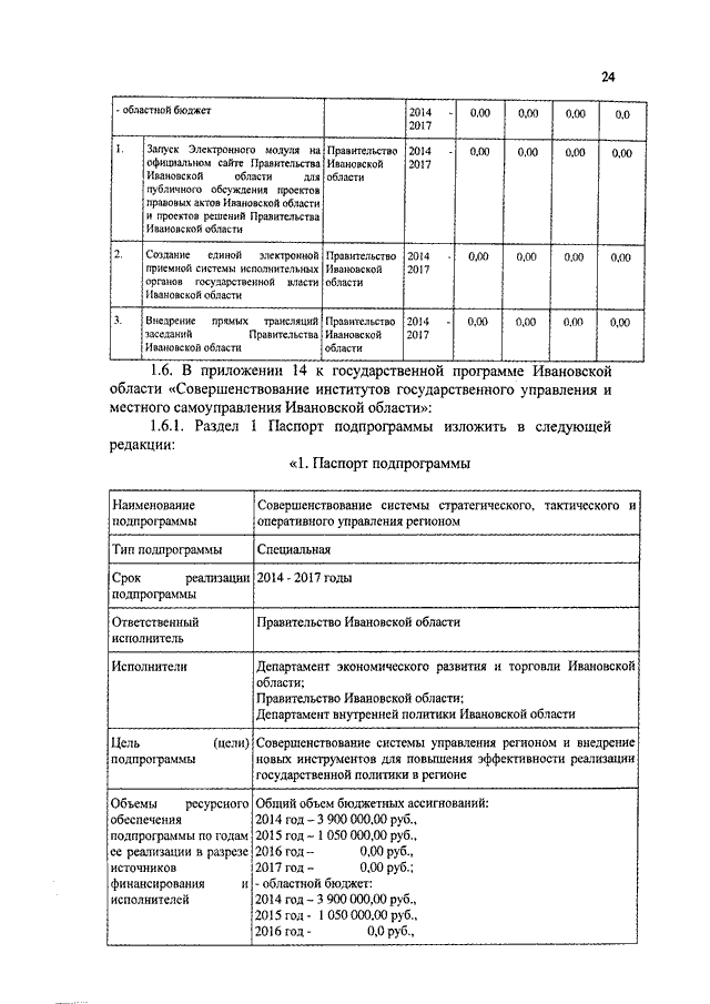 Постановление Правительства Ивановской области от 31.12.2014 N 591-п "О внесении изменений в постановление Правительства Ивановской области от 13.11.2013 N 454-п "Об утверждении государственной программы Ивановской области "Совершенствование институтов государственного управления и местного самоуправления Ивановской области" (вместе с "Подпрограммой "Обеспечение деятельности органов государственной власти Ивановской области", "Подпрограммой "Информационная открытость органов государственной власти Ивановской области", "Подпрограммой "Общественный контроль и экспертная поддержка органов государственной власти Ивановской области", "Подпрограммой "Поддержка социально ориентированных некоммерческих организаций", "Подпрограммой "Укрепление кадрового потенциала государственной службы Ивановской области", "Подпрограммой "Организация дополнительного пенсионного обеспечения отдельных категорий граждан", "Подпрограммой "Вручение государственных наград Российской Федерации, наград Ивановской области и выплата вознаграждений к ним, выплата премий к Почетным грамотам и других премий", "Подпрограммой "Эффективный муниципалитет", "Подпрограммой "Оценка регулирующего воздействия", "Подпрограммой "Организация предоставления государственных и муниципальных услуг на базе областного государственного бюджетного учреждения "Многофункциональный центр предоставления государственных и муниципальных услуг", "Подпрограммой "Организационная и консультационная поддержка национально-культурных автономий и общественных организаций", "Подпрограммой "Обеспечение деятельности мировых судей и аппаратов мировых судей Ивановской области")