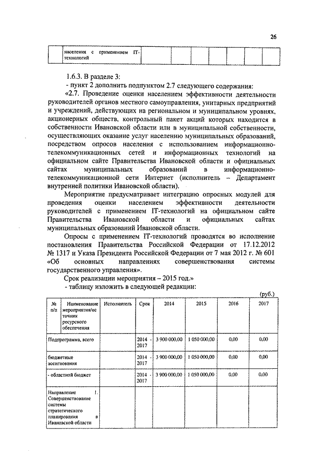 Постановление Правительства Ивановской области от 31.12.2014 N 591-п "О внесении изменений в постановление Правительства Ивановской области от 13.11.2013 N 454-п "Об утверждении государственной программы Ивановской области "Совершенствование институтов государственного управления и местного самоуправления Ивановской области" (вместе с "Подпрограммой "Обеспечение деятельности органов государственной власти Ивановской области", "Подпрограммой "Информационная открытость органов государственной власти Ивановской области", "Подпрограммой "Общественный контроль и экспертная поддержка органов государственной власти Ивановской области", "Подпрограммой "Поддержка социально ориентированных некоммерческих организаций", "Подпрограммой "Укрепление кадрового потенциала государственной службы Ивановской области", "Подпрограммой "Организация дополнительного пенсионного обеспечения отдельных категорий граждан", "Подпрограммой "Вручение государственных наград Российской Федерации, наград Ивановской области и выплата вознаграждений к ним, выплата премий к Почетным грамотам и других премий", "Подпрограммой "Эффективный муниципалитет", "Подпрограммой "Оценка регулирующего воздействия", "Подпрограммой "Организация предоставления государственных и муниципальных услуг на базе областного государственного бюджетного учреждения "Многофункциональный центр предоставления государственных и муниципальных услуг", "Подпрограммой "Организационная и консультационная поддержка национально-культурных автономий и общественных организаций", "Подпрограммой "Обеспечение деятельности мировых судей и аппаратов мировых судей Ивановской области")