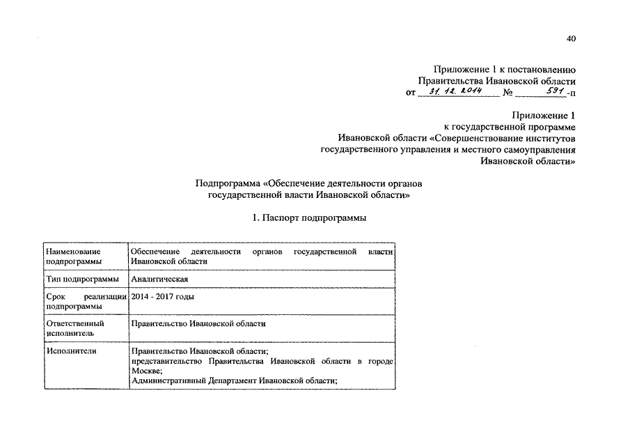 Постановление Правительства Ивановской области от 31.12.2014 N 591-п "О внесении изменений в постановление Правительства Ивановской области от 13.11.2013 N 454-п "Об утверждении государственной программы Ивановской области "Совершенствование институтов государственного управления и местного самоуправления Ивановской области" (вместе с "Подпрограммой "Обеспечение деятельности органов государственной власти Ивановской области", "Подпрограммой "Информационная открытость органов государственной власти Ивановской области", "Подпрограммой "Общественный контроль и экспертная поддержка органов государственной власти Ивановской области", "Подпрограммой "Поддержка социально ориентированных некоммерческих организаций", "Подпрограммой "Укрепление кадрового потенциала государственной службы Ивановской области", "Подпрограммой "Организация дополнительного пенсионного обеспечения отдельных категорий граждан", "Подпрограммой "Вручение государственных наград Российской Федерации, наград Ивановской области и выплата вознаграждений к ним, выплата премий к Почетным грамотам и других премий", "Подпрограммой "Эффективный муниципалитет", "Подпрограммой "Оценка регулирующего воздействия", "Подпрограммой "Организация предоставления государственных и муниципальных услуг на базе областного государственного бюджетного учреждения "Многофункциональный центр предоставления государственных и муниципальных услуг", "Подпрограммой "Организационная и консультационная поддержка национально-культурных автономий и общественных организаций", "Подпрограммой "Обеспечение деятельности мировых судей и аппаратов мировых судей Ивановской области")
