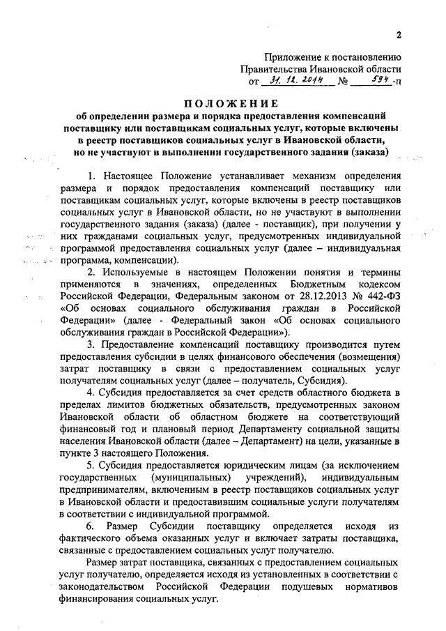 Постановление Правительства Ивановской области от 31.12.2014 N 594-п "Об утверждении Положения об определении размера и порядка предоставления компенсации поставщику или поставщикам социальных услуг, которые включены в реестр поставщиков социальных услуг в Ивановской области, но не участвуют в выполнении государственного задания (заказа)"