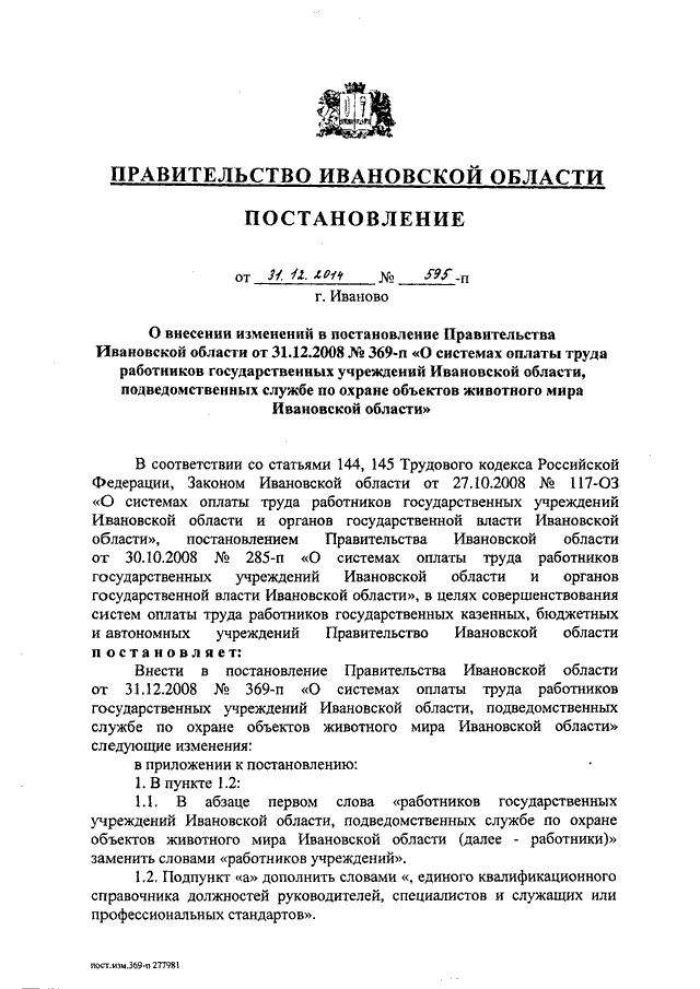 Постановление Правительства Ивановской области от 31.12.2014 N 595-п "О внесении изменений в постановление Правительства Ивановской области от 31.12.2008 N 369-п "О системах оплаты труда работников государственных учреждений Ивановской области, подведомственных службе по охране объектов животного мира Ивановской области"