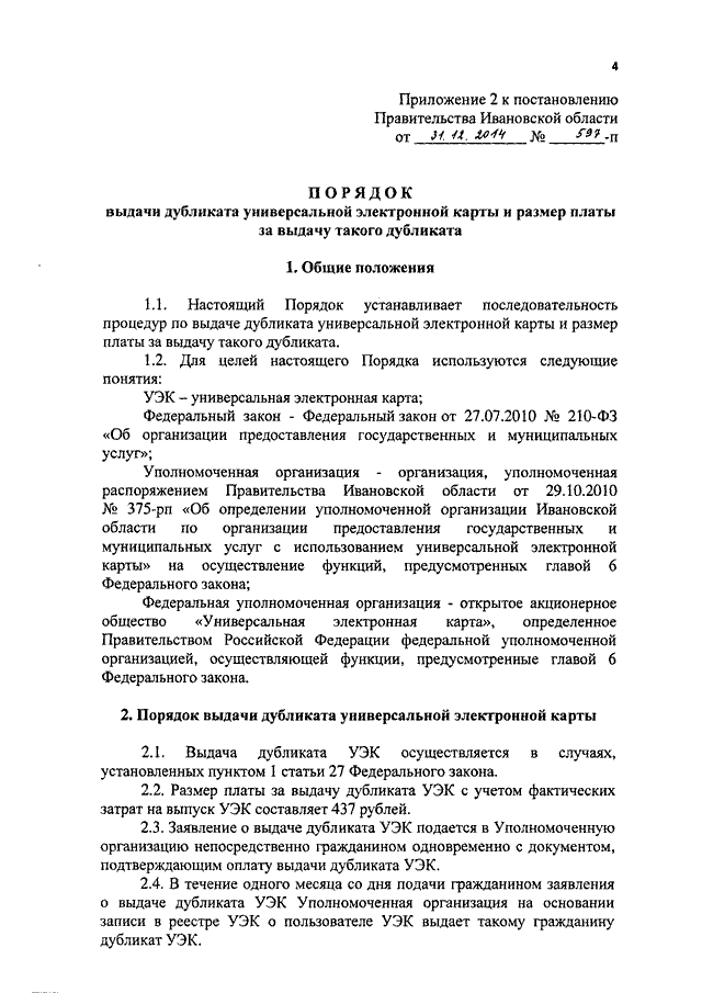 Постановление Правительства Ивановской области от 31.12.2014 N 597-п "Об утверждении порядков доставки универсальной электронной карты, выдачи дубликата универсальной электронной карты и размера платы за его выдачу, направления гражданином информации о выборе банка, обеспечивающего предоставление услуг в рамках электронного банковского приложения универсальной электронной карты"