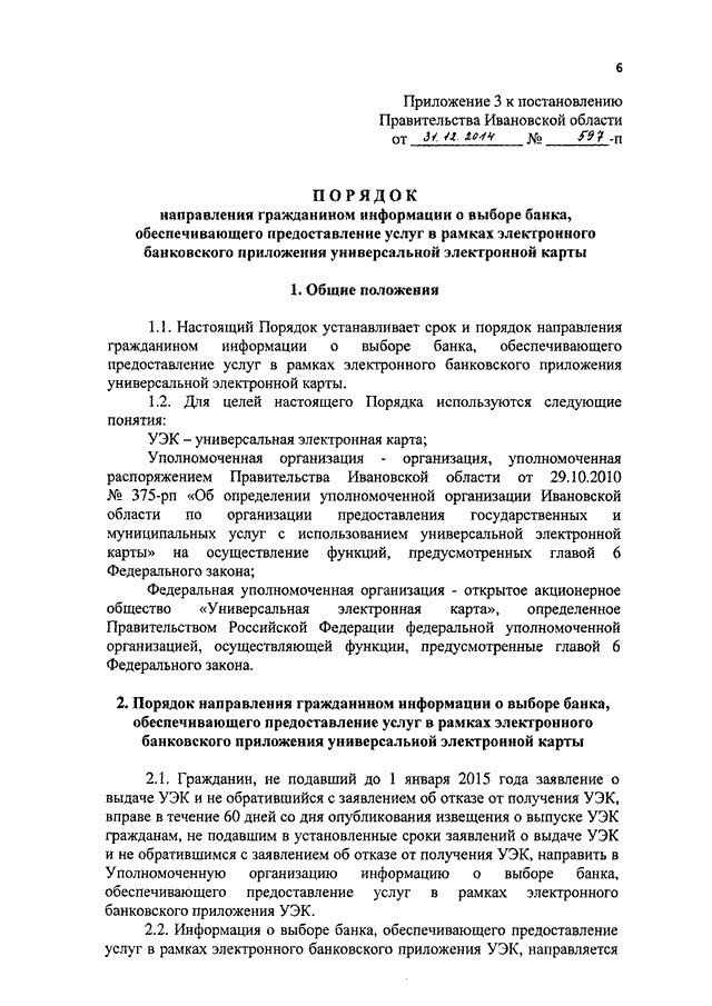 Постановление Правительства Ивановской области от 31.12.2014 N 597-п "Об утверждении порядков доставки универсальной электронной карты, выдачи дубликата универсальной электронной карты и размера платы за его выдачу, направления гражданином информации о выборе банка, обеспечивающего предоставление услуг в рамках электронного банковского приложения универсальной электронной карты"