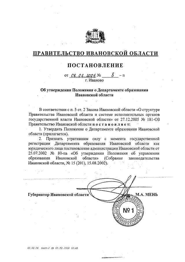 Постановление Правительства Ивановской области от 08.02.2006 N 8-п "Об утверждении Положения о Департаменте образования Ивановской области"