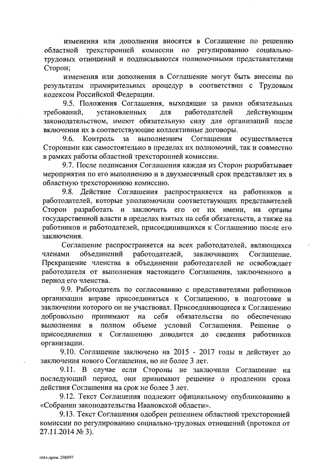 "Соглашение по регулированию социально-трудовых и связанных с ними экономических отношений между Правительством Ивановской области, областным объединением организаций профессиональных союзов, областным объединением работодателей на 2015 - 2017 годы" (Заключено 26.12.2014 N 109-с) (вместе с "Перечнем основных показателей прогноза социально-экономического развития Ивановской области и проекта областного бюджета, по которым проводятся консультации Сторон", "Рекомендациями областной трехсторонней комиссии по регулированию социально-трудовых отношений представителям работников и работодателей по включению положений в коллективный договор организации, отраслевые (межотраслевые), территориальные и иные соглашения по вопросам регулирования социально-трудовых и иных непосредственно связанных с ними отношений")