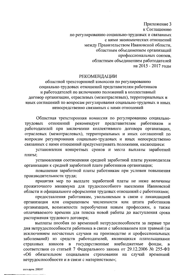 "Соглашение по регулированию социально-трудовых и связанных с ними экономических отношений между Правительством Ивановской области, областным объединением организаций профессиональных союзов, областным объединением работодателей на 2015 - 2017 годы" (Заключено 26.12.2014 N 109-с) (вместе с "Перечнем основных показателей прогноза социально-экономического развития Ивановской области и проекта областного бюджета, по которым проводятся консультации Сторон", "Рекомендациями областной трехсторонней комиссии по регулированию социально-трудовых отношений представителям работников и работодателей по включению положений в коллективный договор организации, отраслевые (межотраслевые), территориальные и иные соглашения по вопросам регулирования социально-трудовых и иных непосредственно связанных с ними отношений")