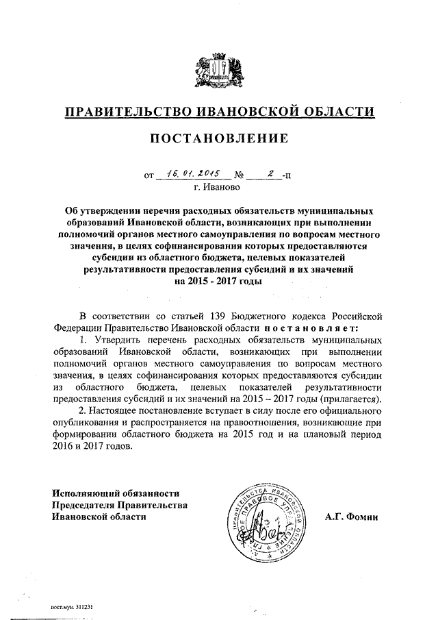 Постановление Правительства Ивановской области от 16.01.2015 N 2-п "Об утверждении перечня расходных обязательств муниципальных образований Ивановской области, возникающих при выполнении полномочий органов местного самоуправления по вопросам местного значения, в целях софинансирования которых предоставляются субсидии из областного бюджета, целевых показателей результативности предоставления субсидий и их значений на 2015 - 2017 годы"