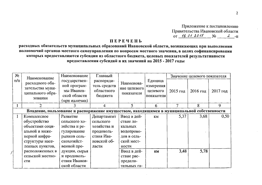 Постановление Правительства Ивановской области от 16.01.2015 N 2-п "Об утверждении перечня расходных обязательств муниципальных образований Ивановской области, возникающих при выполнении полномочий органов местного самоуправления по вопросам местного значения, в целях софинансирования которых предоставляются субсидии из областного бюджета, целевых показателей результативности предоставления субсидий и их значений на 2015 - 2017 годы"
