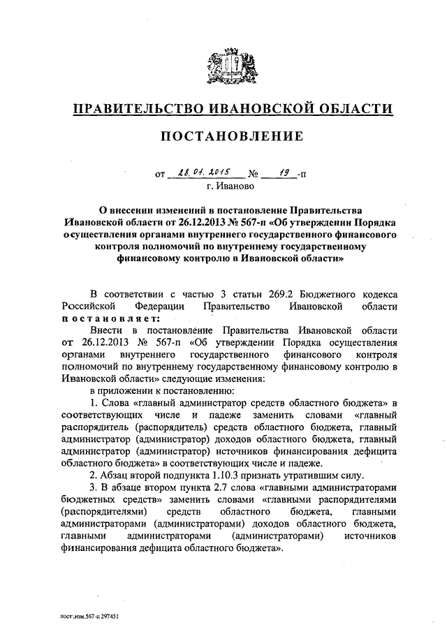Постановление Правительства Ивановской области от 28.01.2015 N 19-п "О внесении изменений в постановление Правительства Ивановской области от 26.12.2013 N 567-п "Об утверждении Порядка осуществления органами внутреннего государственного финансового контроля полномочий по внутреннему государственному финансовому контролю в Ивановской области"
