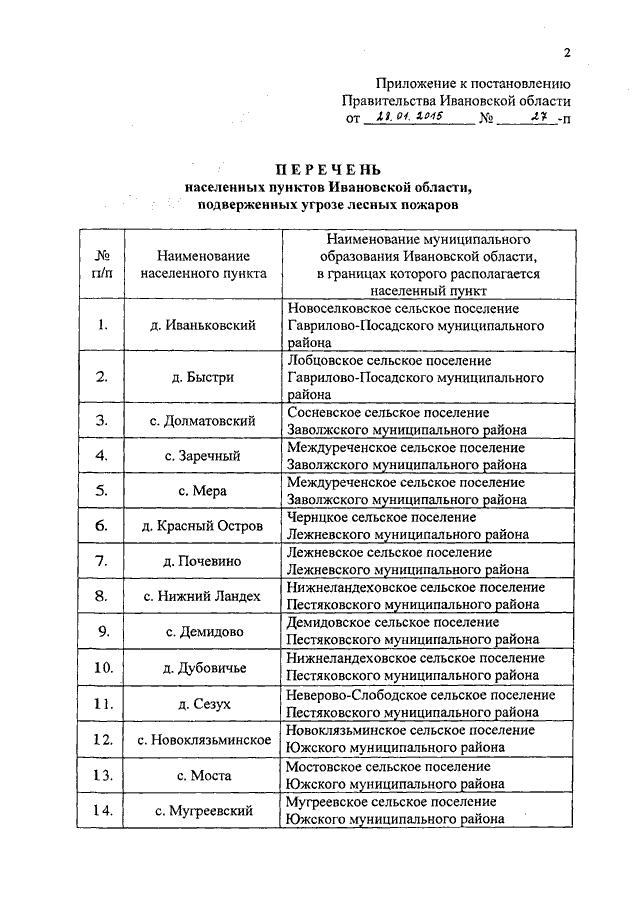 Постановление Правительства Ивановской области от 28.01.2015 N 27-п "Об утверждении перечня населенных пунктов Ивановской области, подверженных угрозе лесных пожаров"