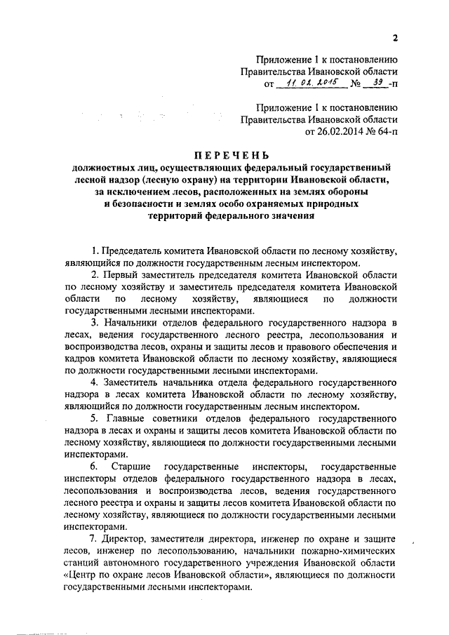 Постановление Правительства Ивановской области от 11.02.2015 N 39-п "О внесении изменений в постановление Правительства Ивановской области от 26.02.2014 N 64-п "Об утверждении перечней должностных лиц, осуществляющих федеральный государственный лесной надзор (лесную охрану) и федеральный государственный пожарный надзор в лесах на территории Ивановской области, за исключением лесов, расположенных на землях обороны и безопасности и землях особо охраняемых природных территорий федерального значения"