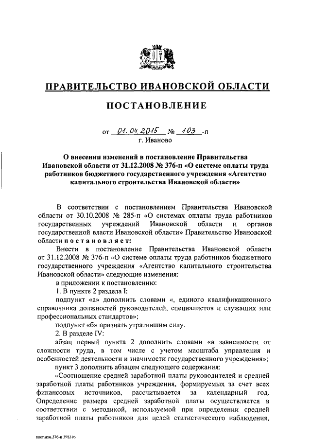 Постановление Правительства Ивановской области от 01.04.2015 N 103-п "О внесении изменений в постановление Правительства Ивановской области от 31.12.2008 N 376-п "О системе оплаты труда работников бюджетного государственного учреждения "Агентство капитального строительства Ивановской области"