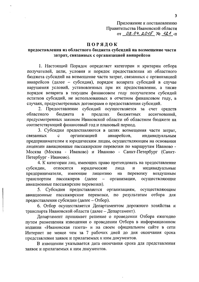 Постановление Правительства Ивановской области от 08.04.2015 N 121-п "Об утверждении Порядка предоставления из областного бюджета субсидий на возмещение части затрат, связанных с организацией авиарейсов"