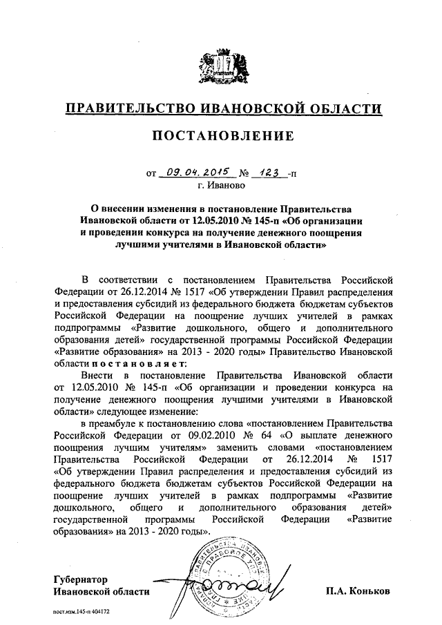 Постановление Правительства Ивановской области от 09.04.2015 N 123-п "О внесении изменения в постановление Правительства Ивановской области от 12.05.2010 N 145-п "Об организации и проведении конкурса на получение денежного поощрения лучшими учителями в Ивановской области"
