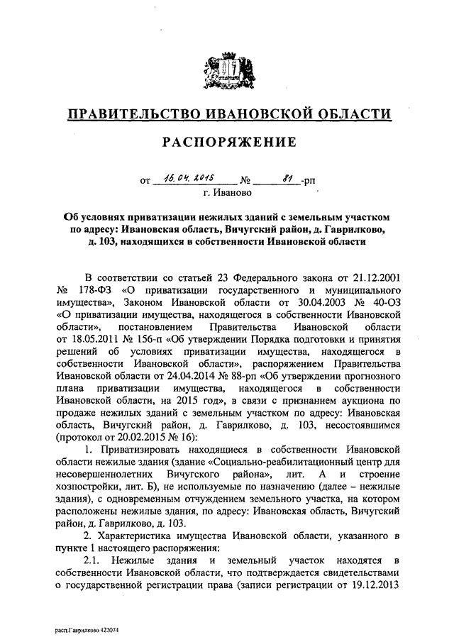Распоряжение Правительства Ивановской области от 15.04.2015 N 81-рп "Об условиях приватизации нежилых зданий с земельным участком по адресу: Ивановская область, Вичугский район, д. Гаврилково, д. 103, находящихся в собственности Ивановской области"