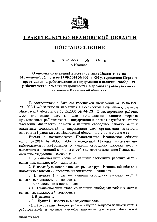 Постановление Правительства Ивановской области от 15.04.2015 N 132-п "О внесении изменений в постановление Правительства Ивановской области от 17.09.2014 N 400-п "Об утверждении Порядка представления работодателями информации о наличии свободных рабочих мест и вакантных должностей в органы службы занятости населения Ивановской области"