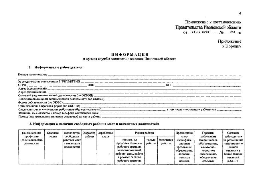 Постановление Правительства Ивановской области от 15.04.2015 N 132-п "О внесении изменений в постановление Правительства Ивановской области от 17.09.2014 N 400-п "Об утверждении Порядка представления работодателями информации о наличии свободных рабочих мест и вакантных должностей в органы службы занятости населения Ивановской области"