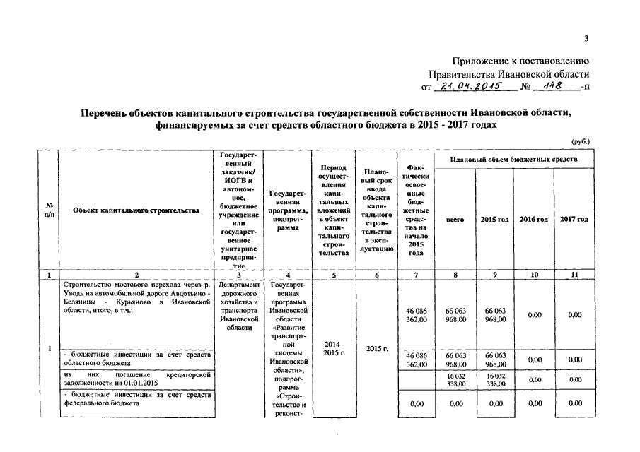 Постановление Правительства Ивановской области от 21.04.2015 N 148-п "Об утверждении перечня объектов капитального строительства государственной собственности Ивановской области, финансируемых за счет средств областного бюджета в 2015 - 2017 годах"