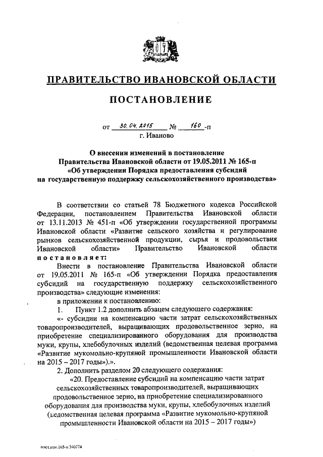 Постановление Правительства Ивановской области от 30.04.2015 N 160-п "О внесении изменений в постановление Правительства Ивановской области от 19.05.2011 N 165-п "Об утверждении Порядка предоставления субсидий на государственную поддержку сельскохозяйственного производства"