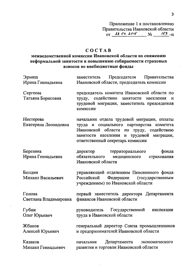 Постановление Правительства Ивановской области от 28.04.2015 N 157-п "О мерах по снижению неформальной занятости и повышению собираемости страховых взносов во внебюджетные фонды" (вместе с "Положением о межведомственной комиссии Ивановской области по снижению неформальной занятости и повышению собираемости страховых взносов во внебюджетные фонды")