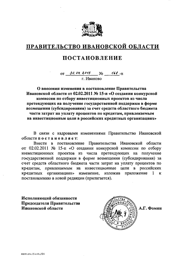 Постановление Правительства Ивановской области от 30.04.2015 N 168-п "О внесении изменения в постановление Правительства Ивановской области от 02.02.2011 N 15-п "О создании конкурсной комиссии по отбору инвестиционных проектов из числа претендующих на получение государственной поддержки в форме возмещения (субсидирования) за счет средств областного бюджета части затрат на уплату процентов по кредитам, привлекаемым на инвестиционные цели в российских кредитных организациях"