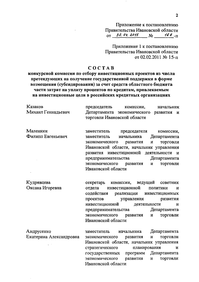 Постановление Правительства Ивановской области от 30.04.2015 N 168-п "О внесении изменения в постановление Правительства Ивановской области от 02.02.2011 N 15-п "О создании конкурсной комиссии по отбору инвестиционных проектов из числа претендующих на получение государственной поддержки в форме возмещения (субсидирования) за счет средств областного бюджета части затрат на уплату процентов по кредитам, привлекаемым на инвестиционные цели в российских кредитных организациях"