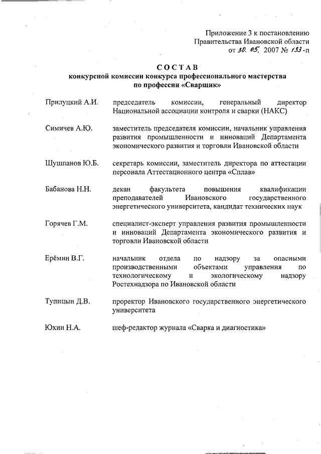 Постановление Правительства Ивановской области от 30.05.2007 N 133-п "О проведении конкурса профессионального мастерства по профессии "Сварщик" (вместе с "Положением о конкурсе профессионального мастерства по профессии "Сварщик", "Положением о командном первенстве за переходящий приз имени Н.Н. Бенардоса")
