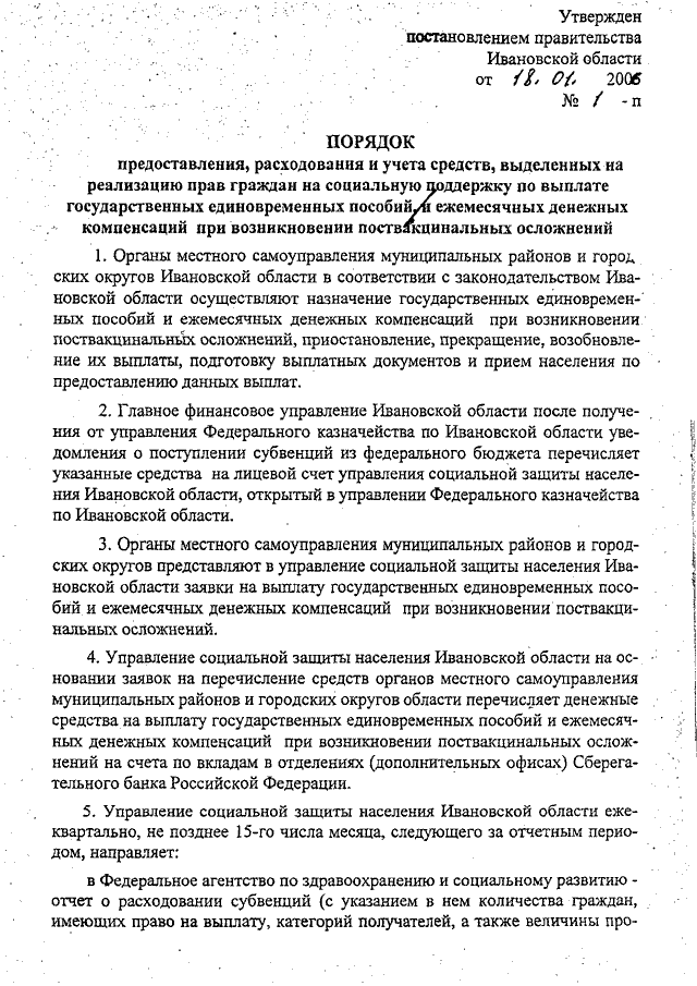 Постановление Правительства Ивановской области от 18.01.2006 N 1-п "О Порядке предоставления, расходования и учета средств, выделенных на реализацию прав граждан на социальную поддержку по выплате государственных единовременных пособий и ежемесячных денежных компенсаций при возникновении поствакцинальных осложнений"
