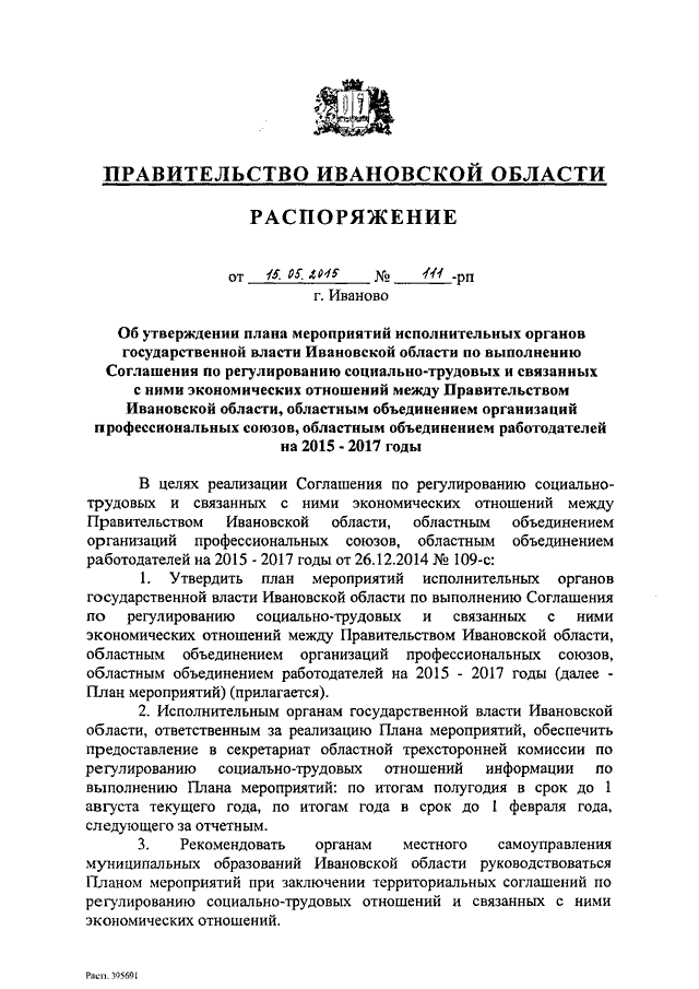 Распоряжение Правительства Ивановской области от 15.05.2015 N 111-рп "Об утверждении плана мероприятий исполнительных органов государственной власти Ивановской области по выполнению Соглашения по регулированию социально-трудовых и связанных с ними экономических отношений между Правительством Ивановской области, областным объединением организаций профессиональных союзов, областным объединением работодателей на 2015 - 2017 годы"