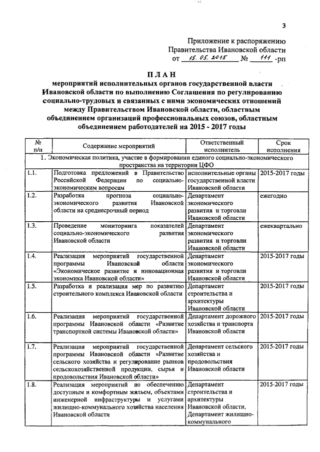 Распоряжение Правительства Ивановской области от 15.05.2015 N 111-рп "Об утверждении плана мероприятий исполнительных органов государственной власти Ивановской области по выполнению Соглашения по регулированию социально-трудовых и связанных с ними экономических отношений между Правительством Ивановской области, областным объединением организаций профессиональных союзов, областным объединением работодателей на 2015 - 2017 годы"