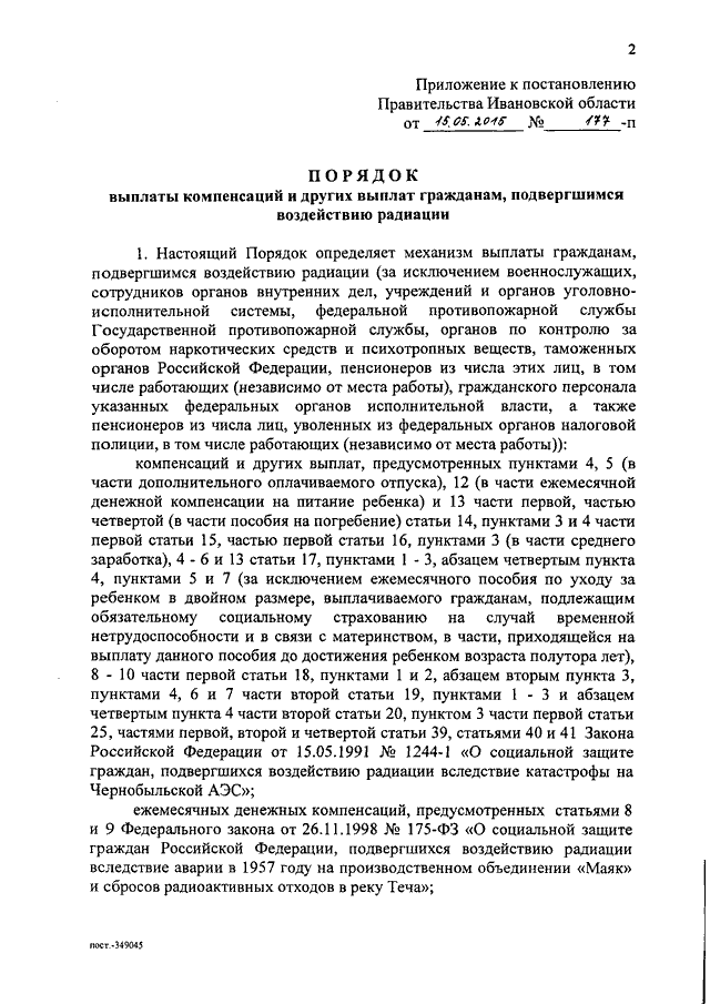 Постановление Правительства Ивановской области от 15.05.2015 N 177-п "Об утверждении Порядка выплаты компенсаций и других выплат гражданам, подвергшимся воздействию радиации"