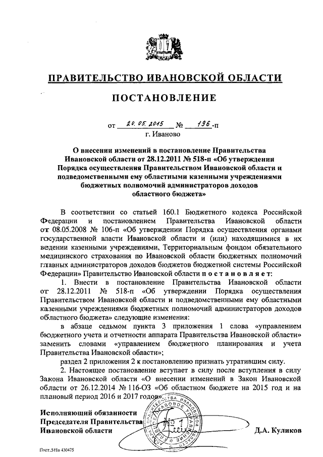Постановление Правительства Ивановской области от 20.05.2015 N 196-п "О внесении изменений в постановление Правительства Ивановской области от 28.12.2011 N 518-п "Об утверждении Порядка осуществления Правительством Ивановской области и подведомственными ему областными казенными учреждениями бюджетных полномочий администраторов доходов областного бюджета"