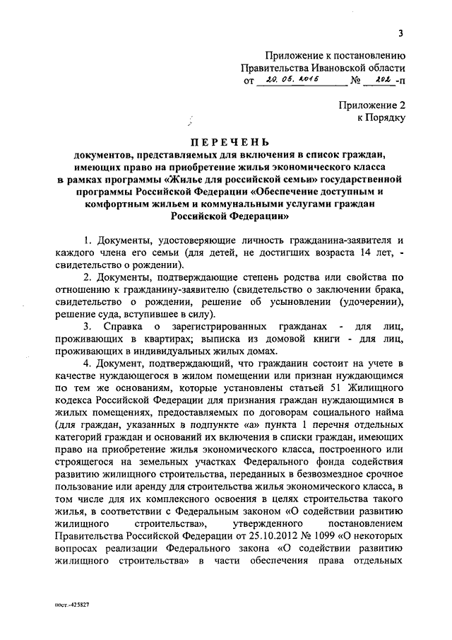 Постановление Правительства Ивановской области от 20.05.2015 N 202-п "О внесении изменений в постановление Правительства Ивановской области от 22.10.2014 N 433-п "Об утверждении перечня категорий граждан, имеющих право на приобретение жилья экономического класса, Порядка формирования списков граждан, имеющих право на приобретение жилья экономического класса, и сводного по Ивановской области реестра таких граждан в рамках программы "Жилье для российской семьи" государственной программы Российской Федерации "Обеспечение доступным и комфортным жильем и коммунальными услугами граждан Российской Федерации" (вместе с "Перечнем документов, представляемых для включения в список граждан, имеющих право на приобретение жилья экономического класса в рамках программы "Жилье для российской семьи" государственной программы Российской Федерации "Обеспечение доступным и комфортным жильем и коммунальными услугами граждан Российской Федерации")