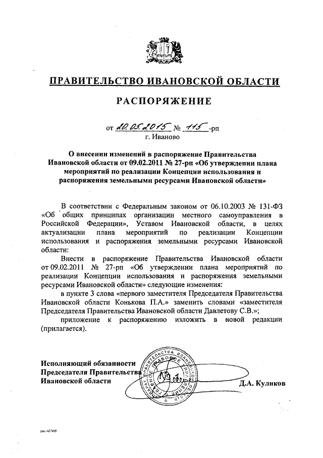 Распоряжение Правительства Ивановской области от 20.05.2015 N 115-рп "О внесении изменений в распоряжение Правительства Ивановской области от 09.02.2011 N 27-рп "Об утверждении плана мероприятий по реализации Концепции использования и распоряжения земельными ресурсами Ивановской области"