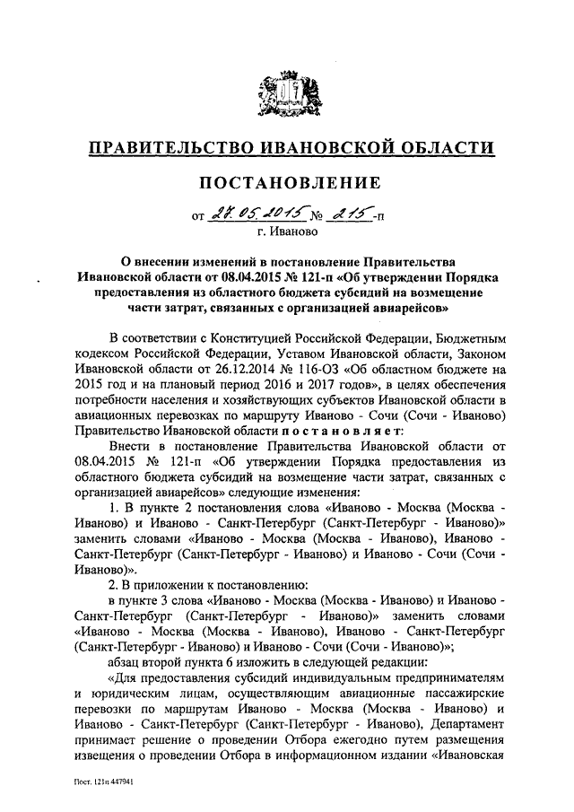 Постановление Правительства Ивановской области от 27.05.2015 N 215-п "О внесении изменений в постановление Правительства Ивановской области от 08.04.2015 N 121-п "Об утверждении Порядка предоставления из областного бюджета субсидий на возмещение части затрат, связанных с организацией авиарейсов"