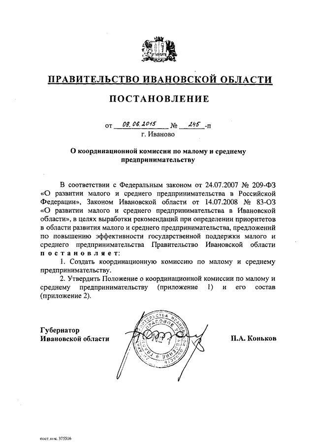 Постановление Правительства Ивановской области от 09.06.2015 N 245-п "О координационной комиссии по малому и среднему предпринимательству" (вместе с "Положением о координационной комиссии по малому и среднему предпринимательству")