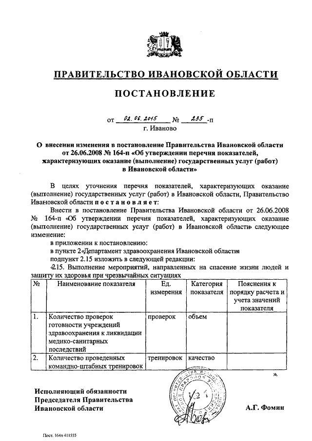 Постановление Правительства Ивановской области от 02.06.2015 N 235-п "О внесении изменения в постановление Правительства Ивановской области от 26.06.2008 N 164-п "Об утверждении перечня показателей, характеризующих оказание (выполнение) государственных услуг (работ) в Ивановской области"