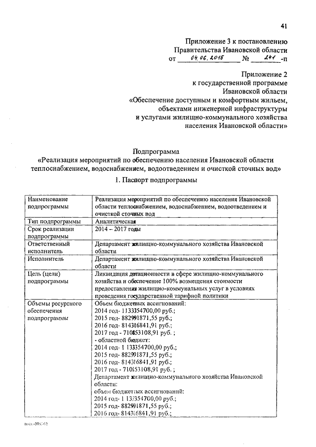 Постановление Правительства Ивановской области от 04.06.2015 N 241-п "О внесении изменений в постановление Правительства Ивановской области от 13.11.2013 N 458-п "Об утверждении государственной программы Ивановской области "Обеспечение доступным и комфортным жильем, объектами инженерной инфраструктуры и услугами жилищно-коммунального хозяйства населения Ивановской области" (вместе с "Подпрограммой "Реализация мероприятий по обеспечению населения Ивановской области теплоснабжением, водоснабжением, водоотведением и очисткой сточных вод")