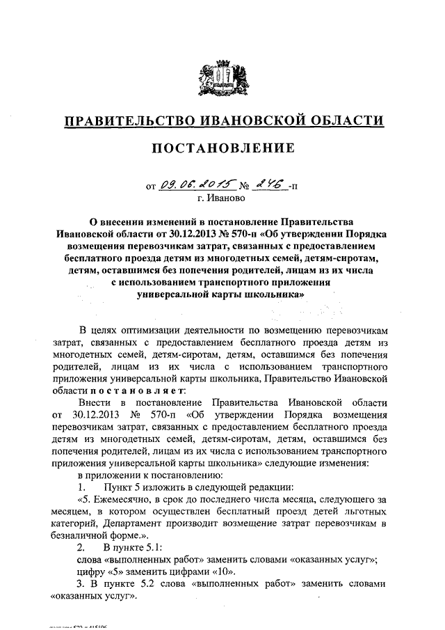 Постановление Правительства Ивановской области от 09.06.2015 N 246-п "О внесении изменений в постановление Правительства Ивановской области от 30.12.2013 N 570-п "Об утверждении Порядка возмещения перевозчикам затрат, связанных с предоставлением бесплатного проезда детям из многодетных семей, детям-сиротам, детям, оставшимся без попечения родителей, лицам из их числа с использованием транспортного приложения универсальной карты школьника"