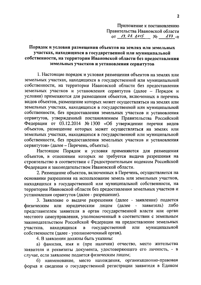 Постановление Правительства Ивановской области от 17.06.2015 N 277-п "Об утверждении порядка и условий размещения объектов на землях или земельных участках, находящихся в государственной или муниципальной собственности, на территории Ивановской области без предоставления земельных участков и установления сервитутов"
