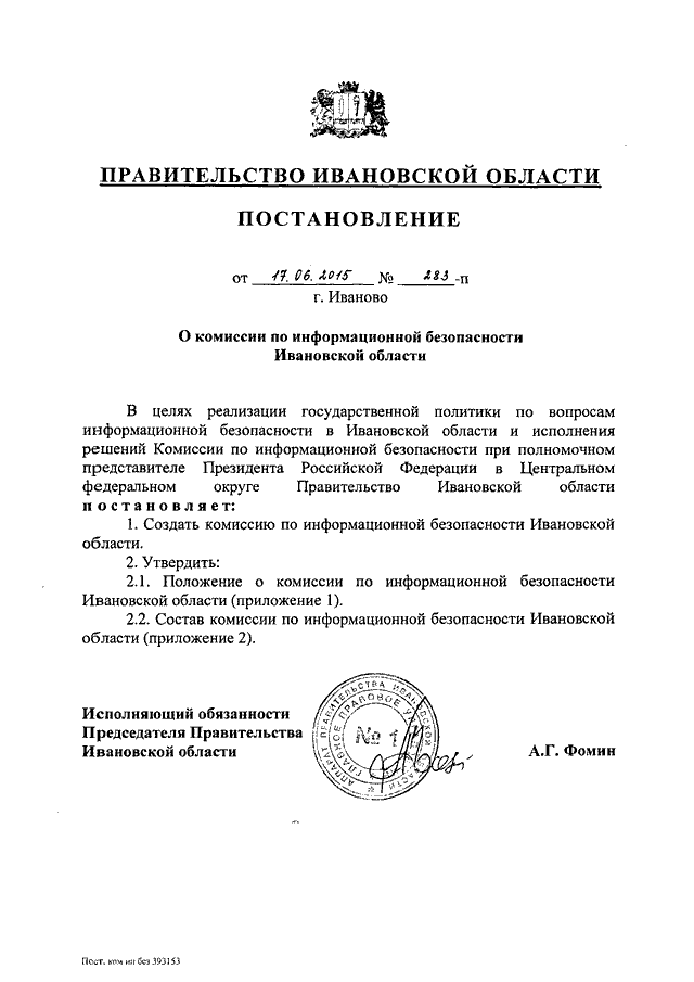 Постановление Правительства Ивановской области от 17.06.2015 N 283-п "О комиссии по информационной безопасности Ивановской области" (вместе с "Положением о комиссии по информационной безопасности Ивановской области")