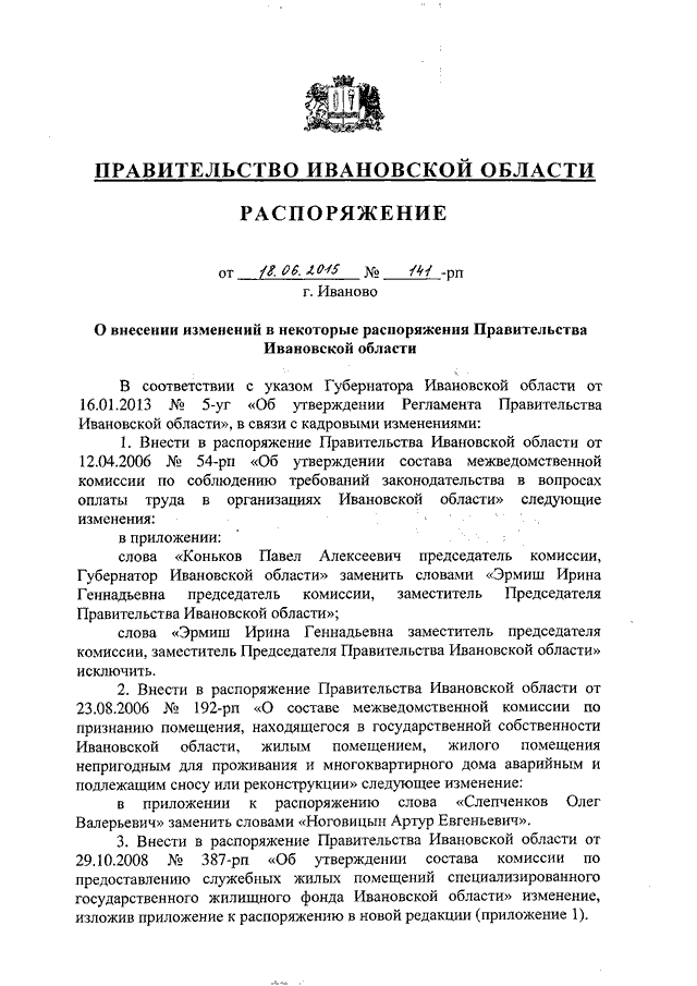 Распоряжение Правительства Ивановской области от 18.06.2015 N 141-рп "О внесении изменений в некоторые распоряжения Правительства Ивановской области"