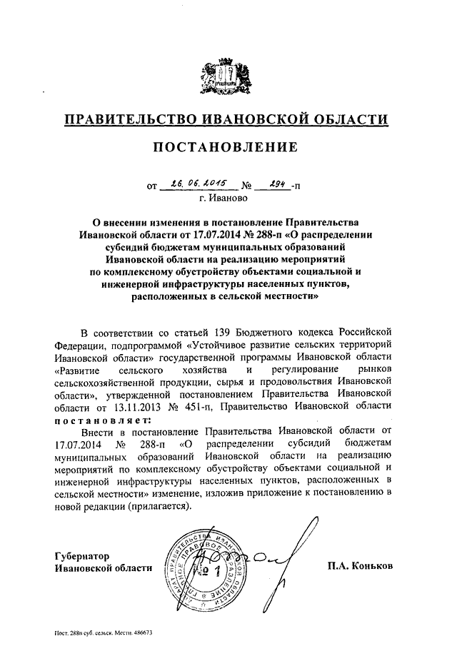 Постановление Правительства Ивановской области от 26.06.2015 N 294-п "О внесении изменения в постановление Правительства Ивановской области от 17.07.2014 N 288-п "О распределении субсидий бюджетам муниципальных образований Ивановской области на реализацию мероприятий по комплексному обустройству объектами социальной и инженерной инфраструктуры населенных пунктов, расположенных в сельской местности"
