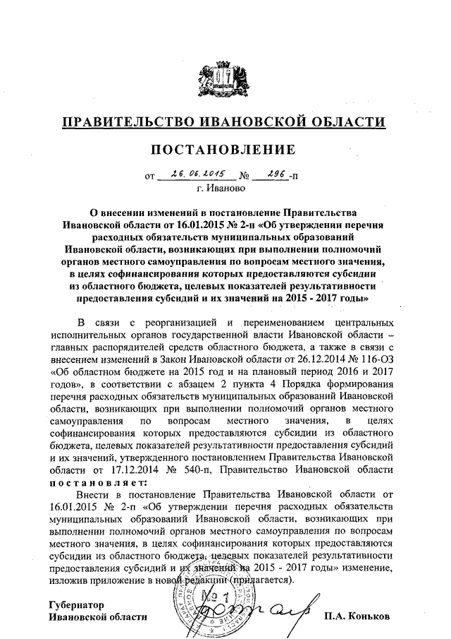 Постановление Правительства Ивановской области от 26.06.2015 N 296-п "О внесении изменений в постановление Правительства Ивановской области от 16.01.2015 N 2-п "Об утверждении перечня расходных обязательств муниципальных образований Ивановской области, возникающих при выполнении полномочий органов местного самоуправления по вопросам местного значения, в целях софинансирования которых предоставляются субсидии из областного бюджета, целевых показателей результативности предоставления субсидий и их значений на 2015 - 2017 годы"