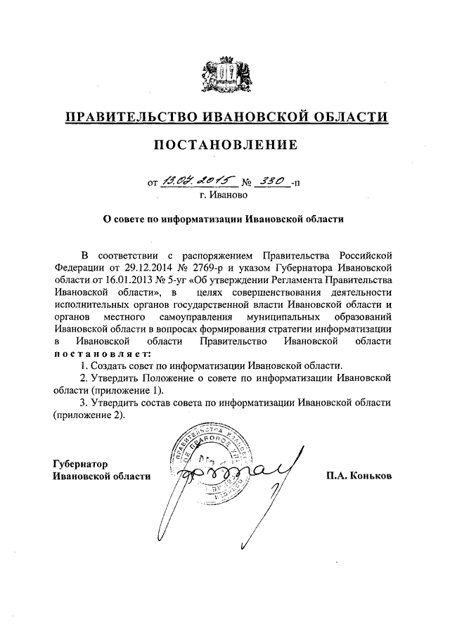 Постановление Правительства Ивановской области от 13.07.2015 N 330-п "О совете по информатизации Ивановской области" (вместе с "Положением о совете по информатизации Ивановской области")