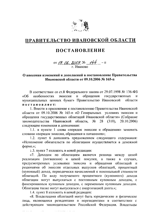 Постановление Правительства Ивановской области от 19.06.2007 N 144-п "О внесении изменений и дополнений в постановление Правительства Ивановской области от 09.10.2006 N 165-п"