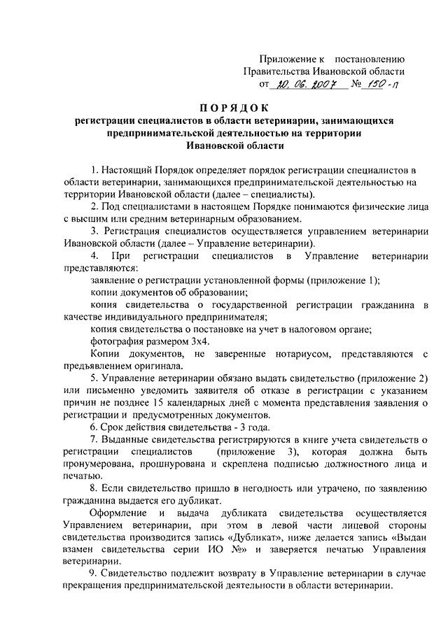 Постановление Правительства Ивановской области от 20.06.2007 N 150-п "Об утверждении Порядка регистрации специалистов в области ветеринарии, занимающихся предпринимательской деятельностью на территории Ивановской области"