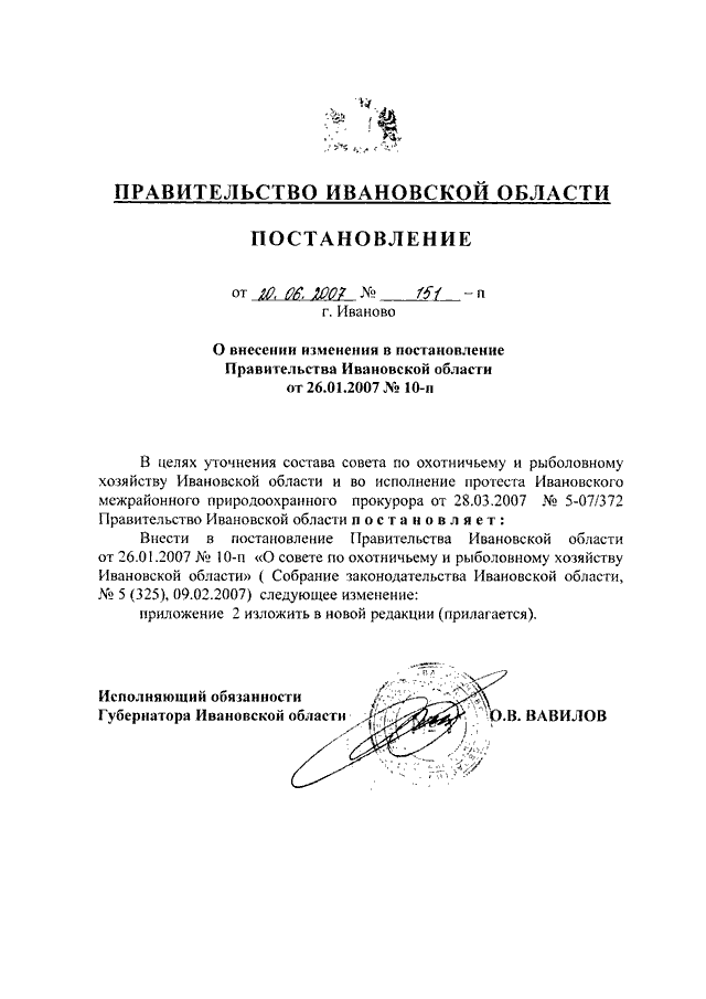 Постановление Правительства Ивановской области от 20.06.2007 N 151-п "О внесении изменения в постановление Правительства Ивановской области от 26.01.2007 N 10-п"